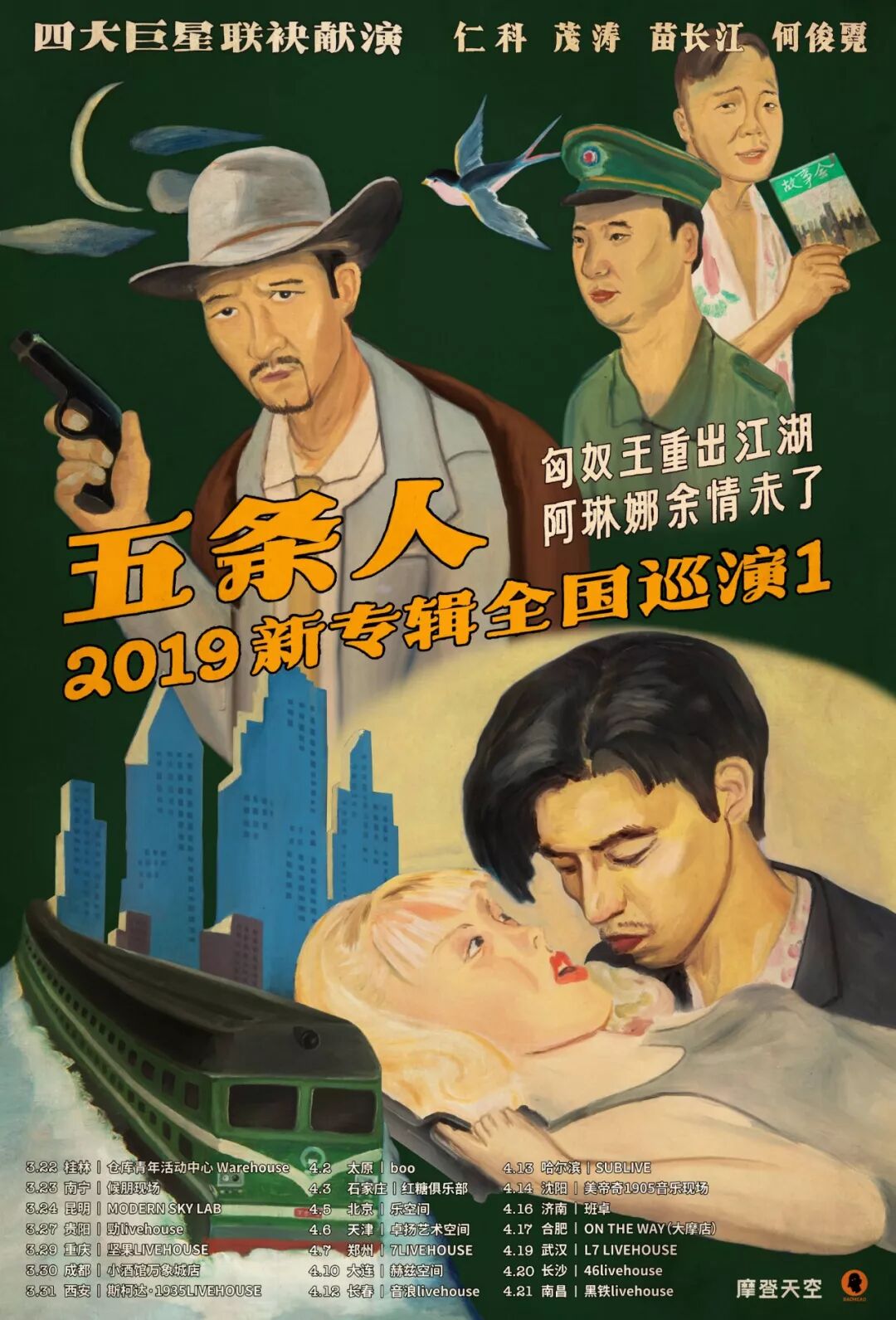 五条人乐队(以下简称五条人)的两位创建者之一,茂涛,这么解释2019新专辑全国巡演海报上,那句非常显眼的“匈奴王重出江湖,阿琳娜余情未了。”