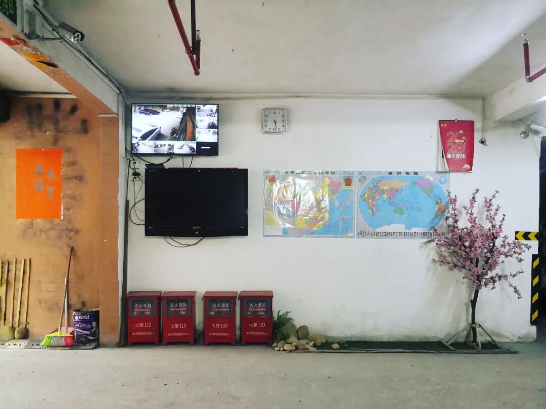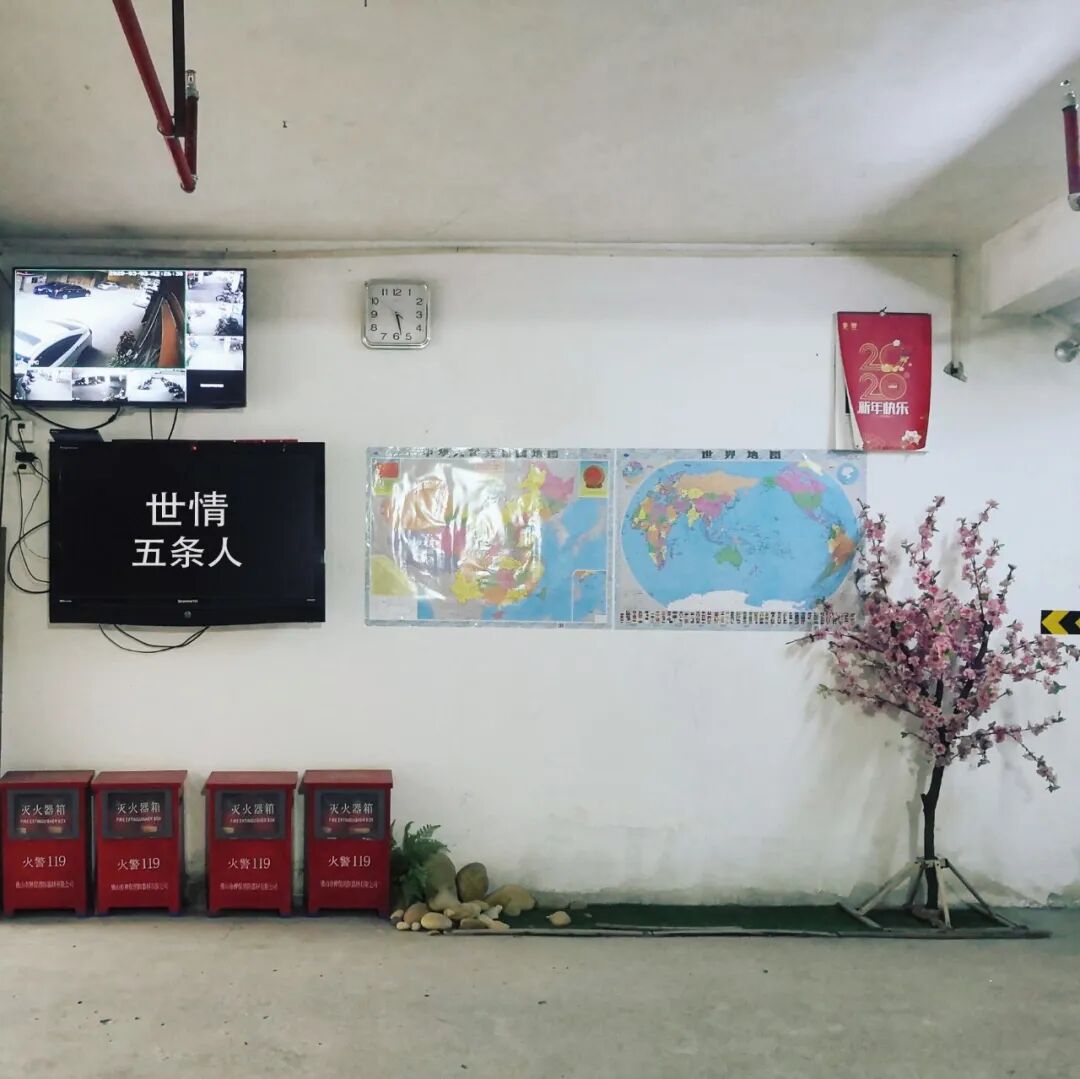 于是这张拍摄于海丰某个停车场的照片,便成就了这张不好看的唱片封面。原先它只被用于专辑中《世情》一歌的单曲封面。五条人在葡萄牙海滩的照片,被P进了停车场的电视里。这是没有任何“审美”,没有丝毫“艺术色彩”的一个画面:停车场的闭路电视——信息传播、娱乐、监控;中国地图和世界地图;扫帚和灭火器;一盆桃花——估计是塑料花。